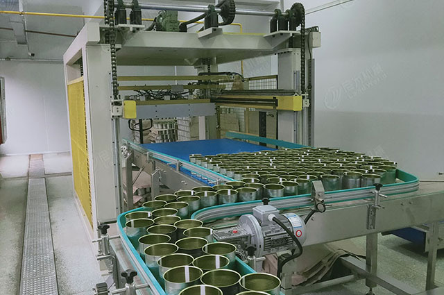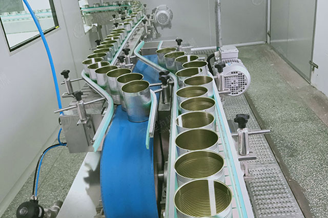 空罐卸垛機(jī)——磁力洗罐機(jī)——鼓泡清洗機(jī)——預(yù)煮機(jī)——流槽冷卻機(jī)——量杯灌裝機(jī)——淋湯機(jī)——封罐機(jī)——裝卸籠機(jī)——滾杠巴氏殺菌機(jī)——風(fēng)刀——臥式貼標(biāo)機(jī)——開箱機(jī)——裝箱機(jī)——封箱機(jī)——紙箱碼垛機(jī)