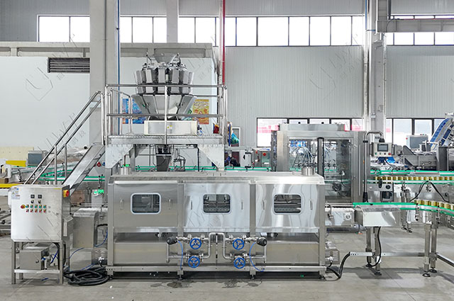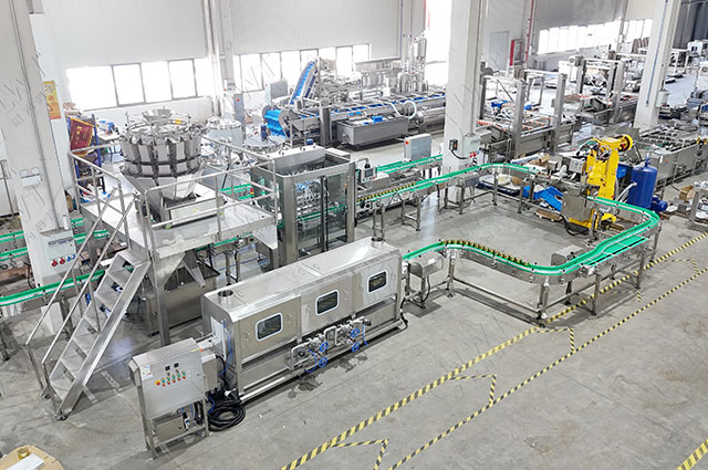 鼓泡清洗-預(yù)煮—振動瀝水——固體物灌裝——液體灌裝——封口機(jī)——實罐清洗——稱重檢測——自動封箱